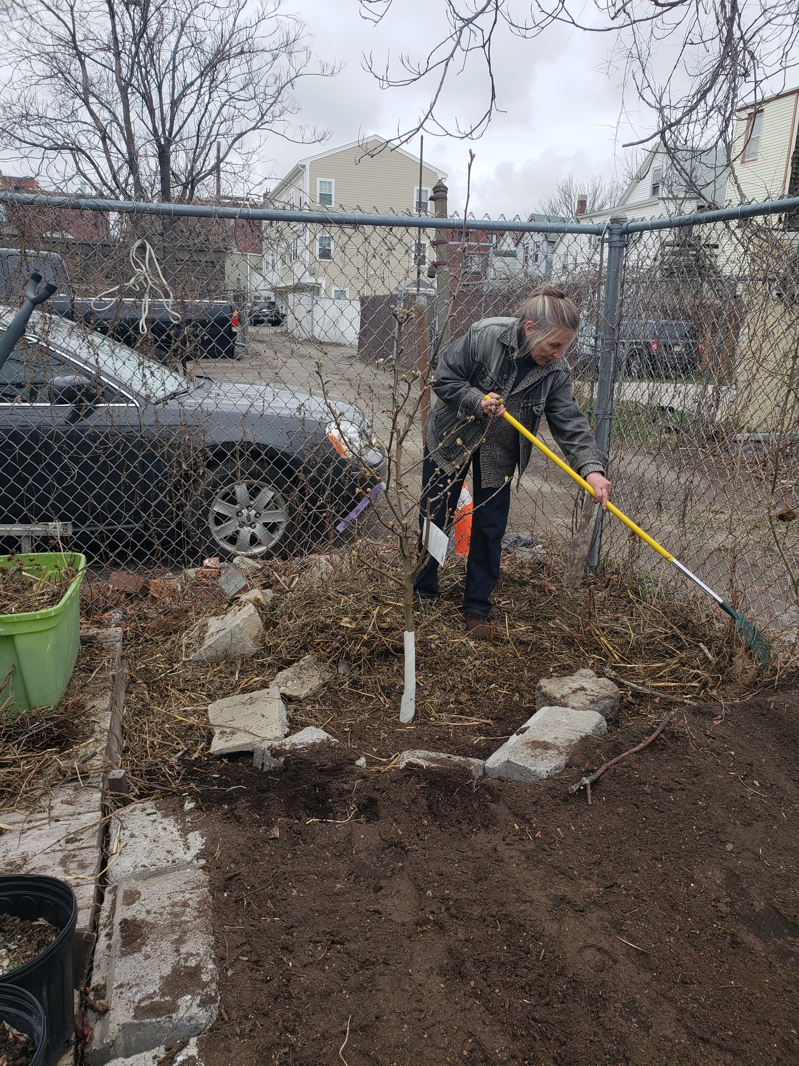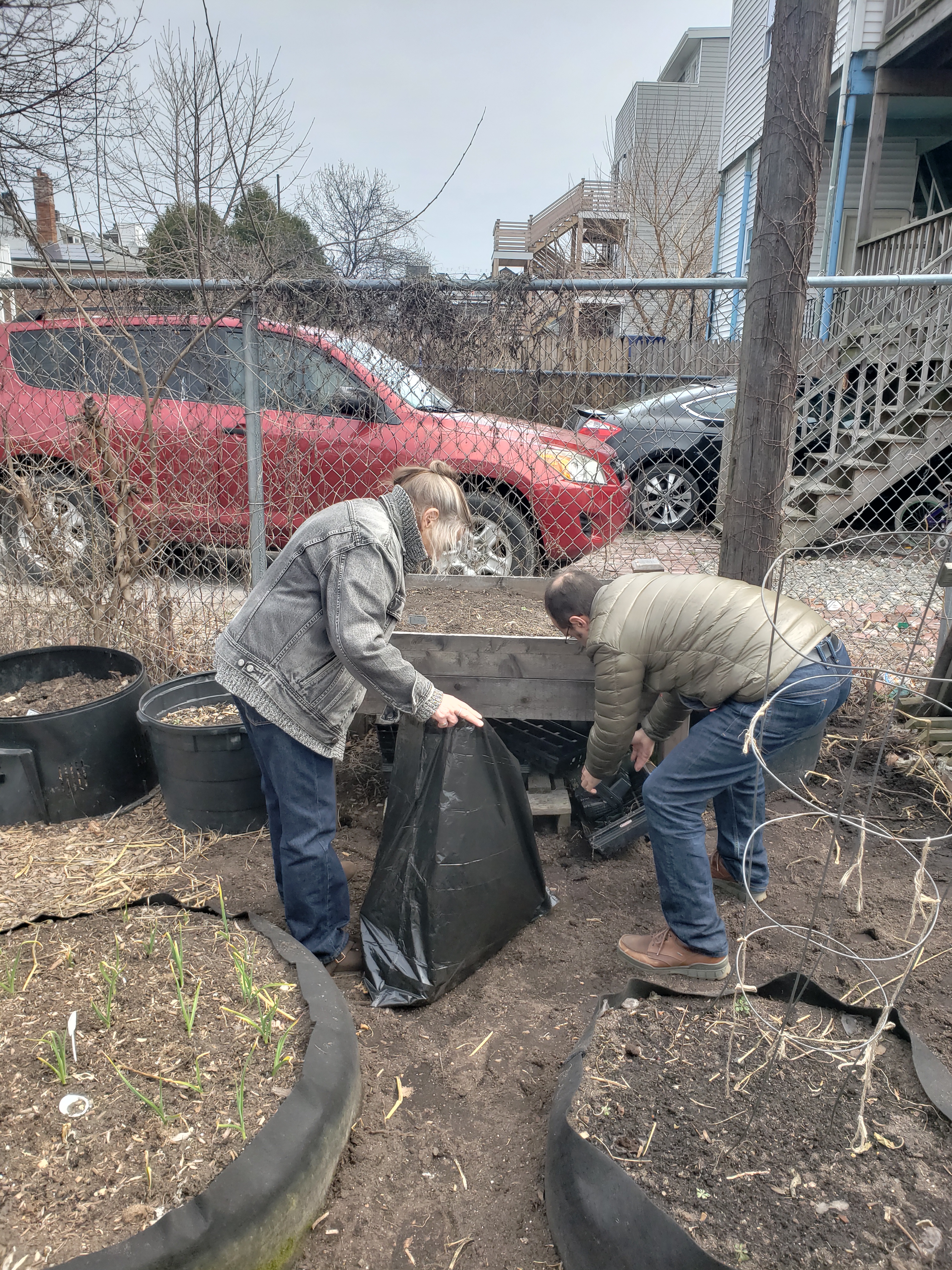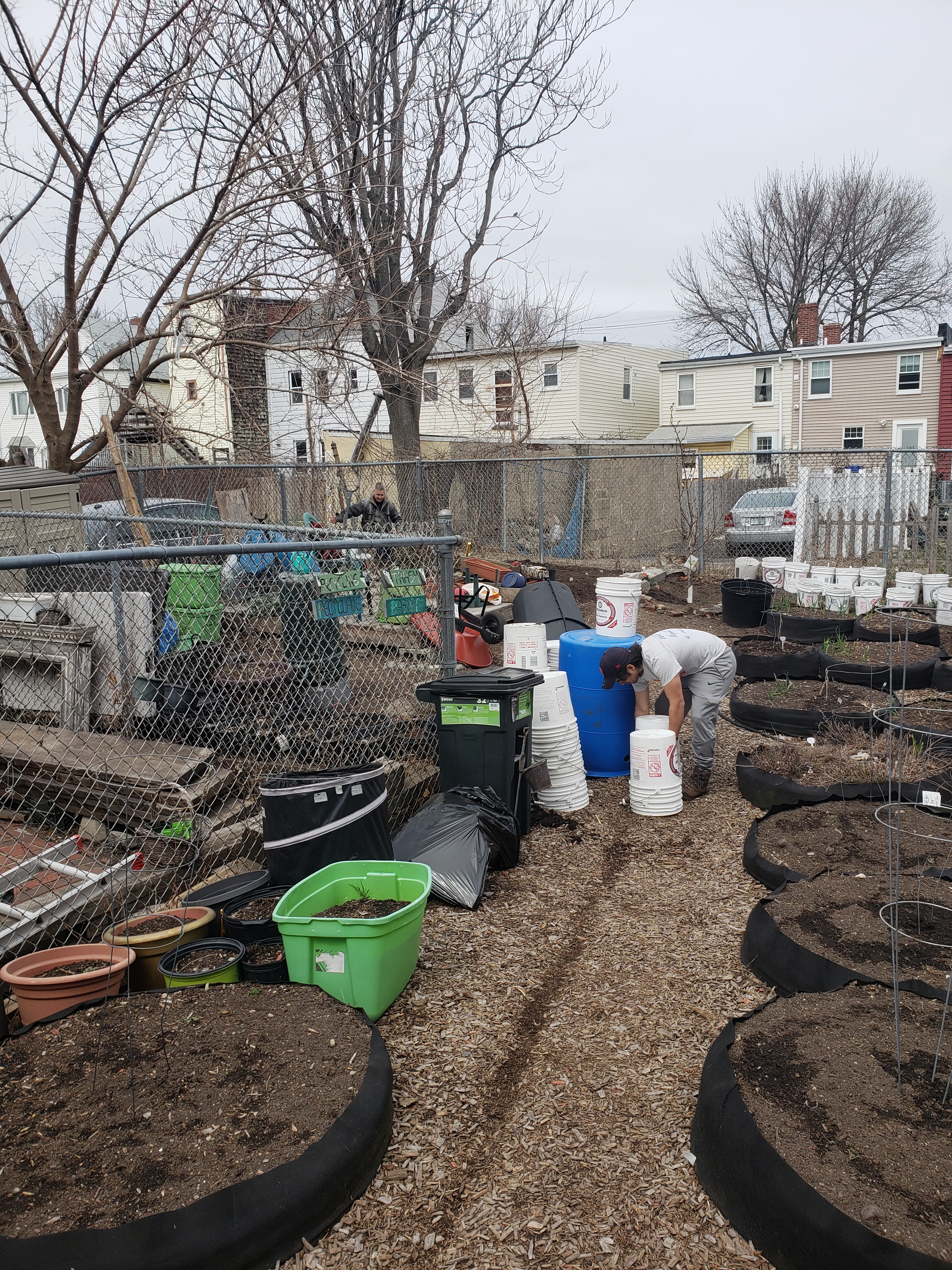 Like someone who is leaving a party half-heartedly, winter is taking its time with a long good-bye. So we were lucky to have a nice warm day today to keep things moving at the farm: more cold-weather crop seeds in the ground, more organizing the space for easier access, protecting the young Persimmon and Asian Pear trees, sheet-mulching in spaces that were eroded, and planning, and chatting.