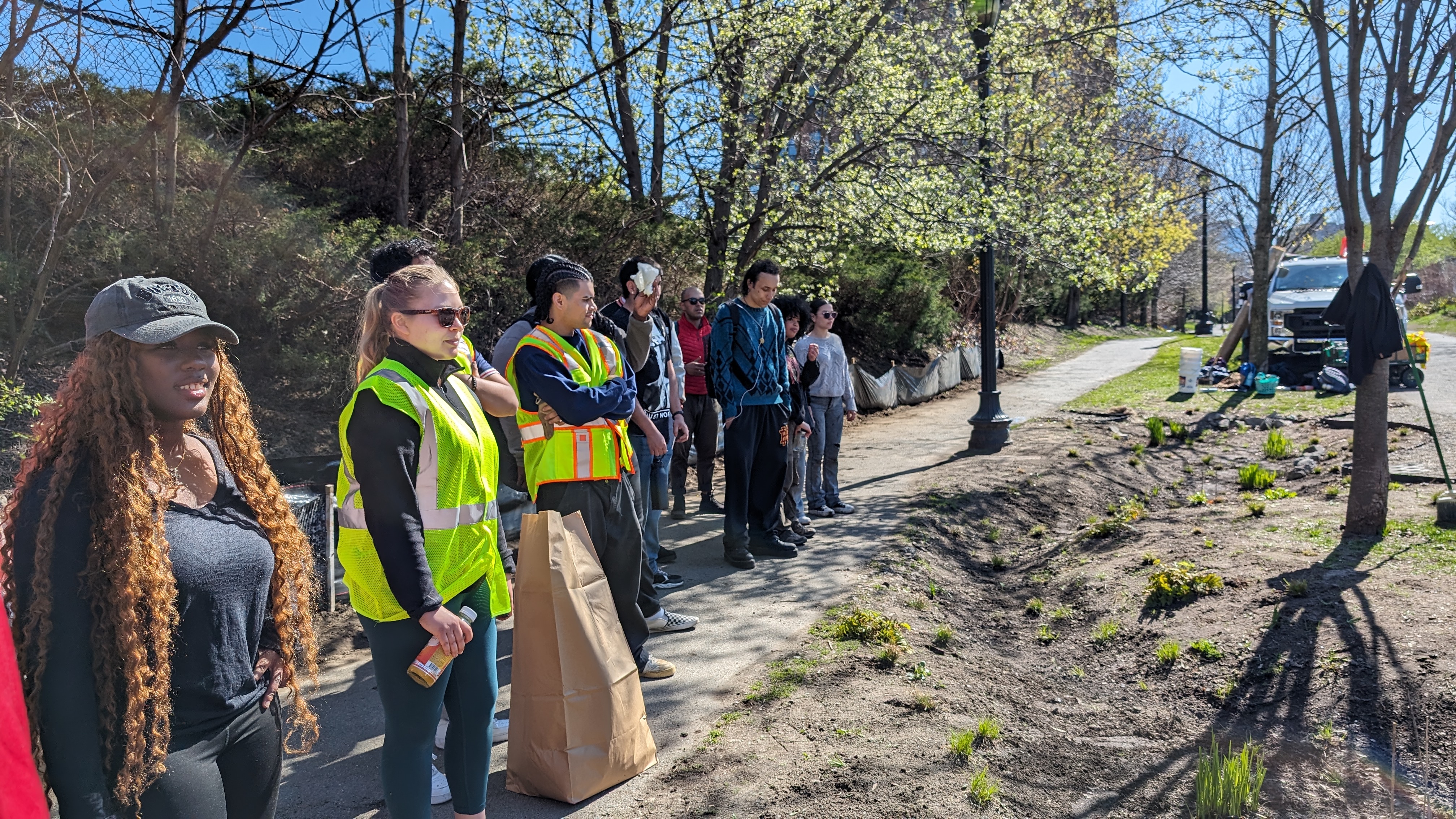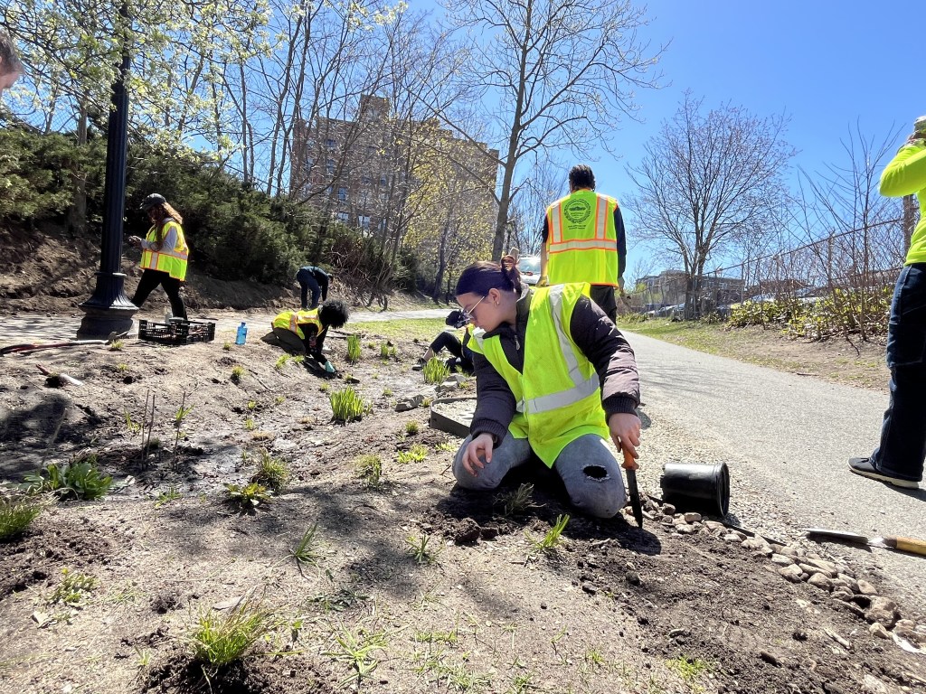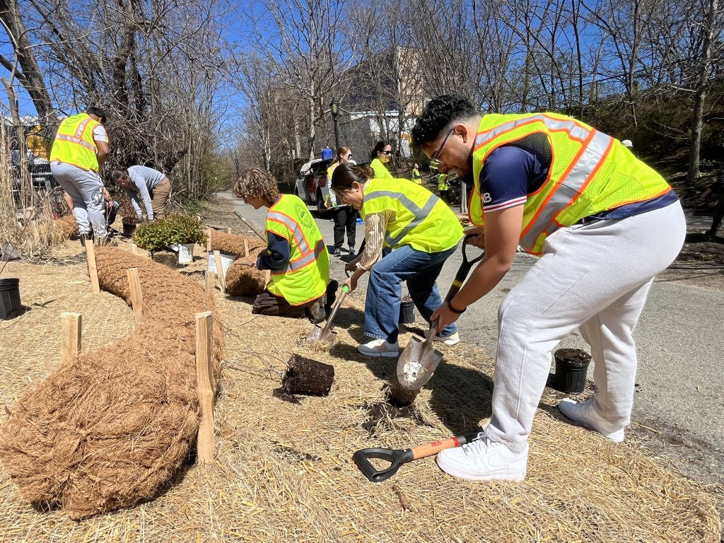 To celebrate Earth Day, our Climate Corps Fellows work at the Mary Ellen Welch Greenway to improve the rain garden.