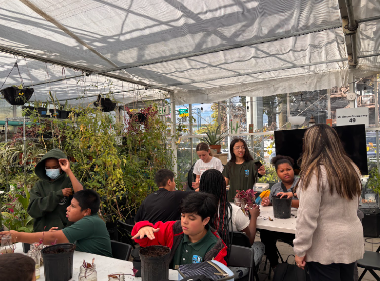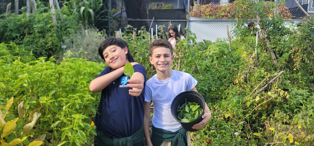 During their visit, a few fellows including myself, guided the students through several activities that connected them to the plants and the earth. One of the main projects was transplanting Silver Inchworm Plants. After giving them a step by step guide on how to move the plants, each student had the chance to carefully transfer the seedlings into new pots, learning how to handle the delicate roots and give them the best chance to thrive. The best part? They got to take these plants home, carrying with them a little piece of the farm’s mission to nurture and grow. Fellows also assisted the students in harvesting fresh basil, teaching the students about the importance of timing in gardening. Harvesting herbs at the right moment not only gives you the best flavors but also encourages the plant to actually grow more. They loved getting to see and smell the basil up close, learning how fresh food tastes when grown sustainably.