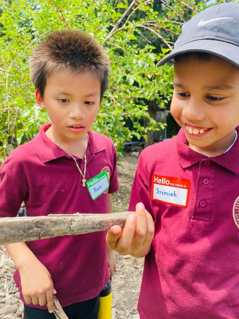 The real adventure began at the soil barrel. As soon as students learned that soil, unlike dirt, is alive, the digging kicked into high gear. Tiny critters wriggled into view, and per Eastie Farm tradition, every bug got a name. Among the most beloved of the day: Pablo and John Cena, two champion decomposers who stole the show.