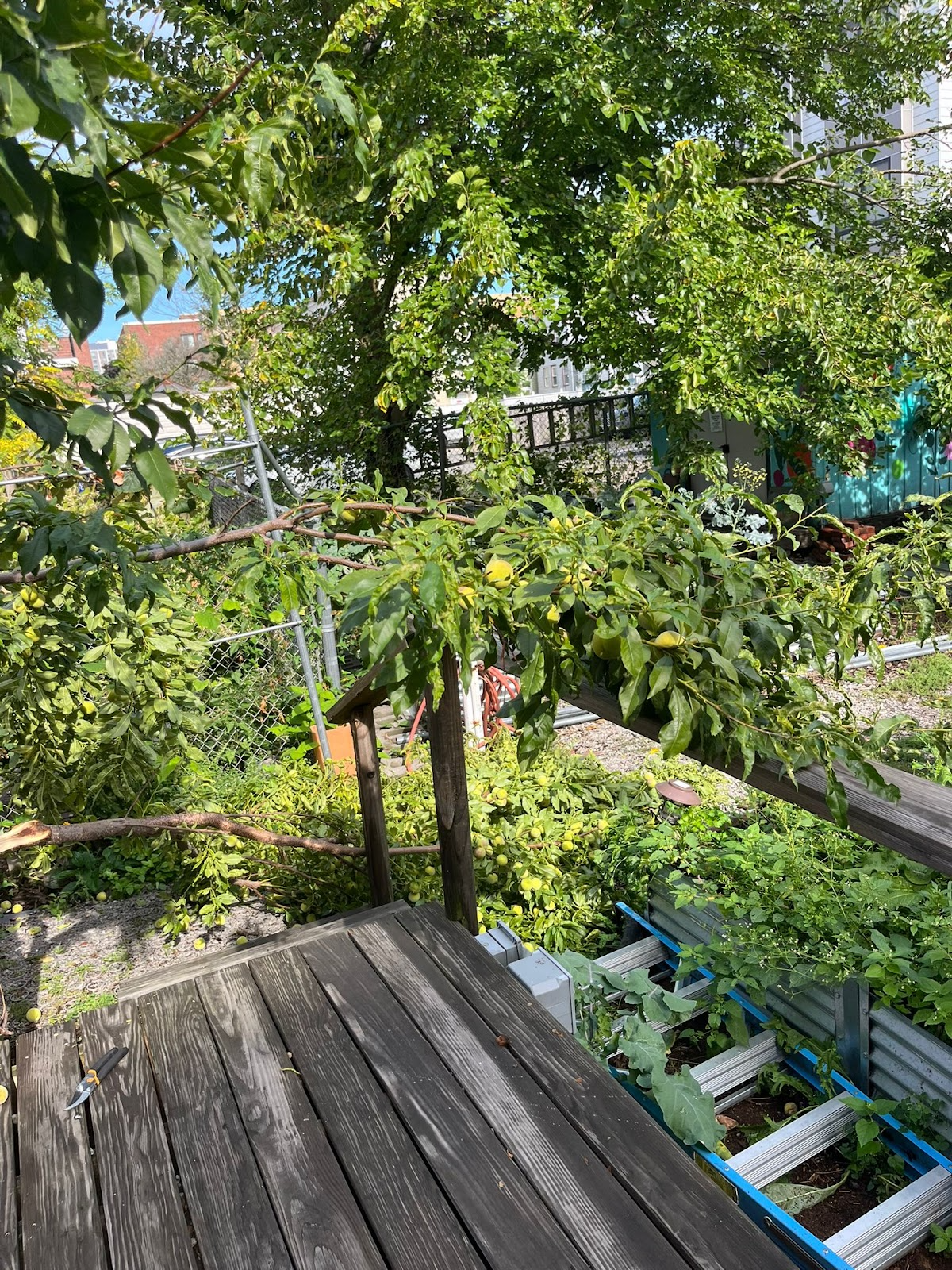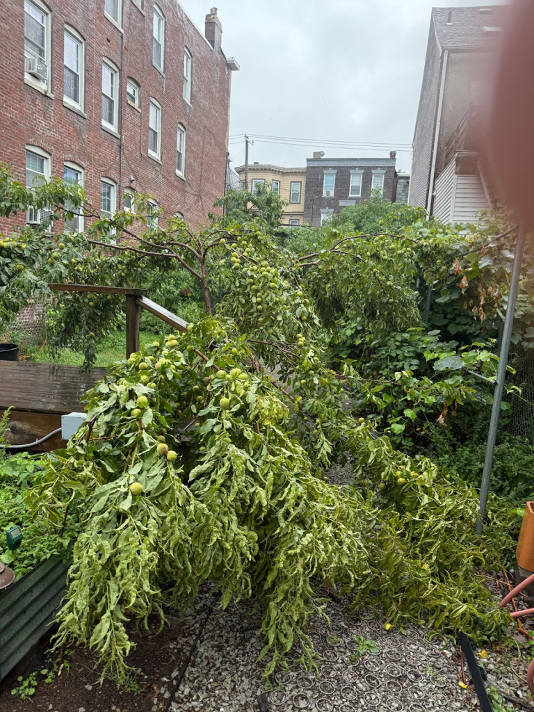 This Sunday morning we found the peach tree by the stage in our Sumner Street garden cracked in half. It was not windy enough to cause this and no lightning struck; so what happened?