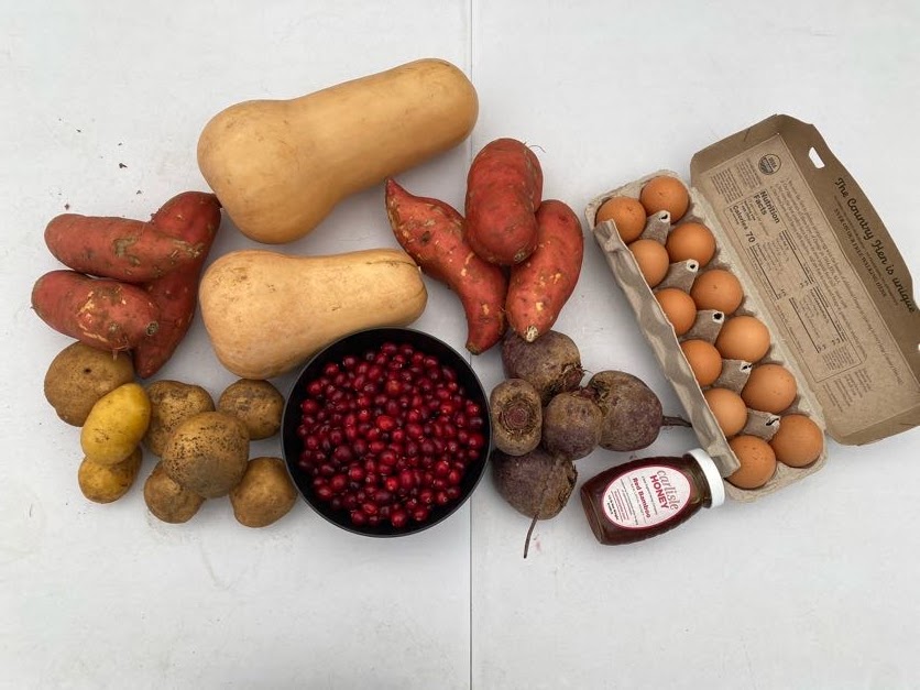 1 fruit, 1-2 root vegetables, 1 bunch of leafy greens, plus additional items such as mushrooms, eggs, microgreens, and value-added items like honey.