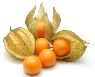 Small, orange berry with a husk. 1/2– 3/4” sweet golden berries inside papery husks, resembling small, straw-colored Japanese lanterns. The flavor is quite sweet and a bit wild. Plants are profusely branching, prolific, and drop ripe fruits. Fruits can be eaten raw, dried like raisins, frozen, canned, or made into preserves, cooked pies, and desserts.